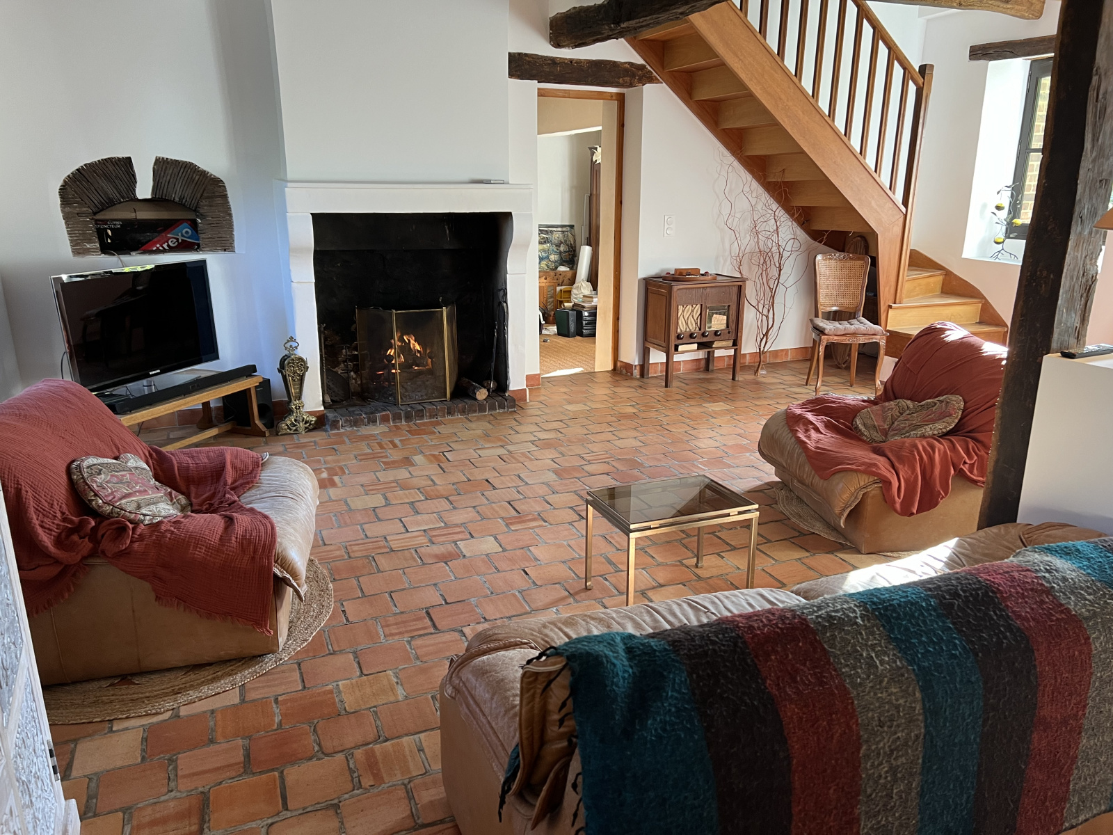 Belle longère rénovée d'une surface de 180 m2 comprenant : entrée ,séjour salon cheminée de 60 m2 environ avec cuisine semi-ouverte entièrement équipée,buanderie,chaufferie (chaudière à granulés datant de 5 ans)wc -lave mains; chambre de 36 m2 env